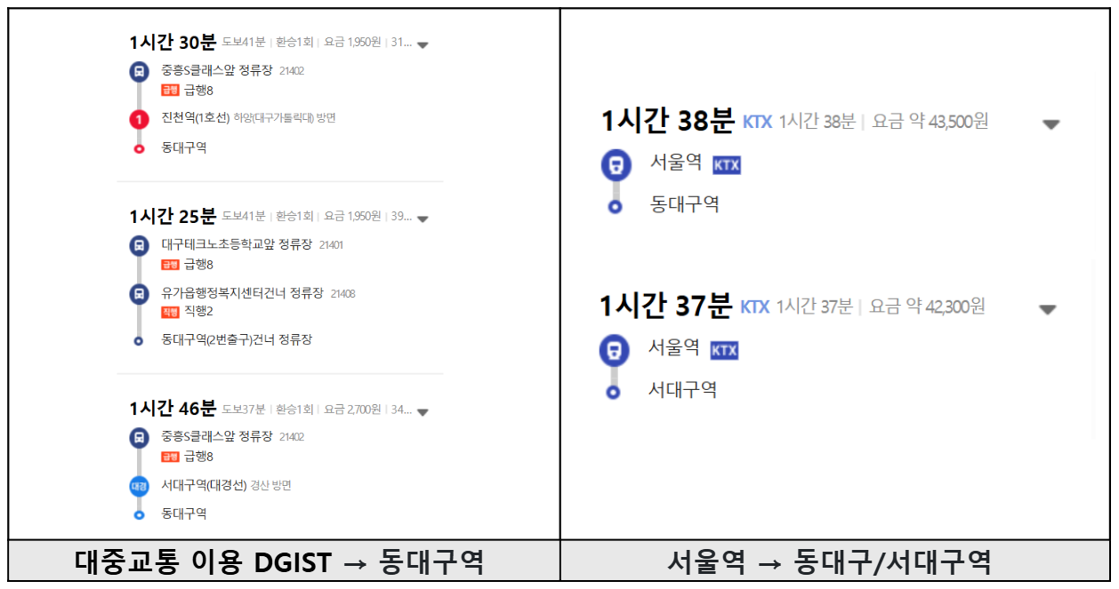 DGIST에서 동대구역으로 가는 경로를 살펴보면 그 복잡함이 드러난다. E7 학보사실에서 출발한 학생은 S1 옆 쪽문으로 나와 중흥S클래스 앞 정류장까지 약 20분을 걸어야 한다. 급행8번 버스를 타면 20분 후 진천역에 도착하고, 이후 도시철도 1호선으로 17개 역을 지나 30분 후에 동대구역에 도착한다. 여기에 1호선 역과 철도역 사이 도보 10분을 더하면 총 80분이 소요된다.