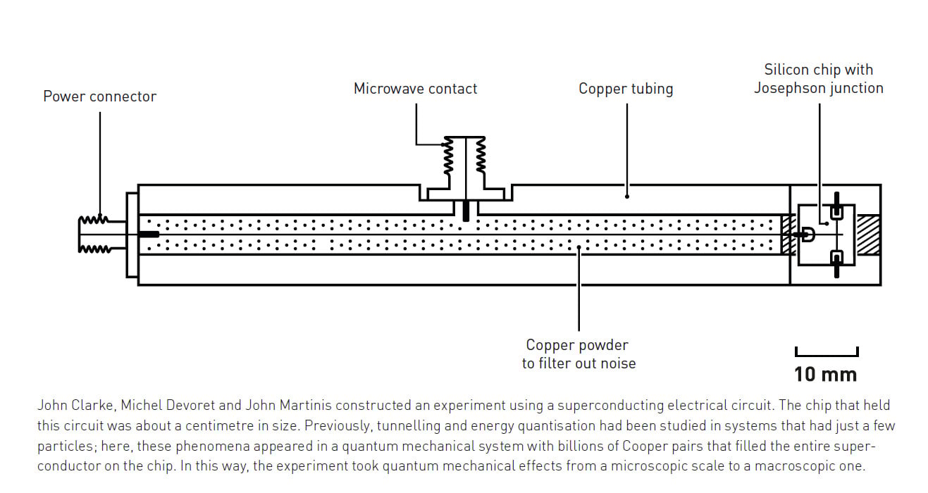 수상자들이 연구한 조지프슨 접합은 전압이 없는 상태와 전압이 있는 상태, 두 가지 상태를 가진다. 전압이 없는 상태에서 전압이 있는 상태로 전환하려면 에너지 장벽을 넘어야 한다. 고전역학에 따르면 회로에 충분한 에너지를 공급해야만 이 장벽을 넘어 상태가 전환될 수 있다. 하지만 수상자들은 극저온에서 충분한 에너지를 공급하지 않았는데도 회로 상태가 전환되는 현상을 관측했다.