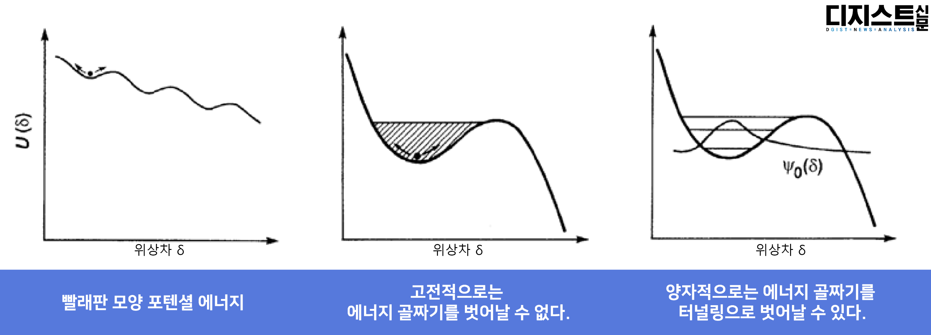 고전역학을 따르면 에너지가 충분하지 않을 시 골짜기에서 탈출할 수 없다. 그러나 양자역학에서는 입자가 에너지 장벽을 터널링으로 통과할 수 있다. 수상자들은 이 터널링 현상으로 인해 위상차가 시간에 따라 변하면서 전압이 발생하는 상태를 관측한 것이다.