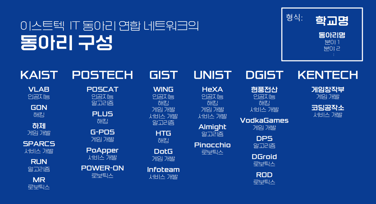 현재 이스트텍 IT 동아리 연합에 소속된 동아리는 다음과 같다.