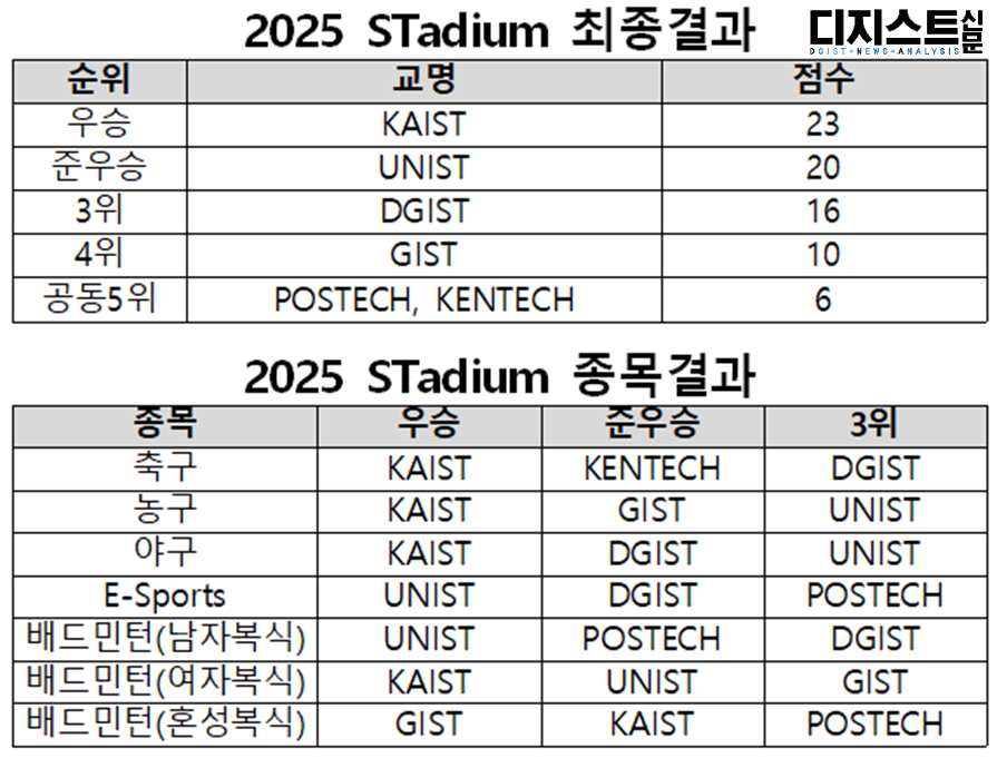 2025 STadium 최종 결과는 ▲우승: KAIST ▲준우승: UNIST ▲3위: DGIST였으며, DGIST는 야구 및 E-스포츠에서 준우승을, 축구와 배드민턴(남자복식)에서 3위를 차지하였다.