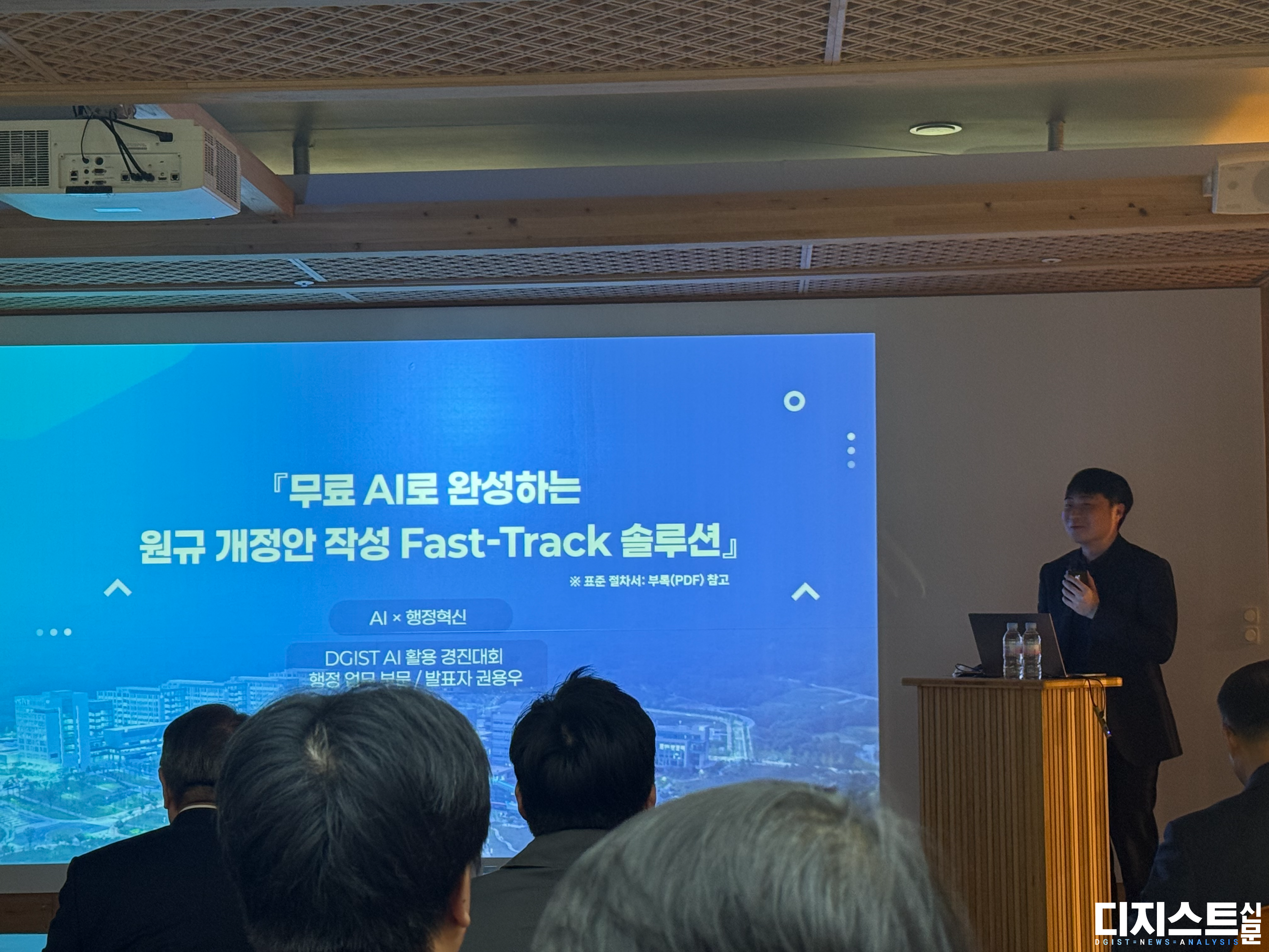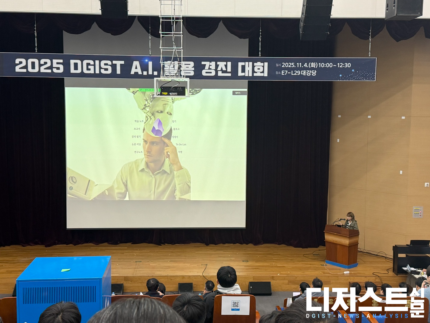 지난 11월 4일 E7 L29에서 제1회 DGIST AI 활용 경진대회 공개 발표회가 열렸다. 원내 우수 AI 활용 사례 발굴을 목적으로 한 이번 대회는 슈퍼컴퓨팅AI교육연구센터(이하 AI교육센터) 주최로 진행되어 직원과 학생을 포함한 DGIST 전 구성원을 대상으로 하였다. ▲학생 역량 부문 5인 ▲교육 연구 부문 5인 ▲행정 업무 부문 3인으로 총 13인이 참가해 자신의 AI 활용 사례를 발표했다. 대회 결과 1, 2, 3위는 모두 행정 업무 부문 참가자가 수상했다.