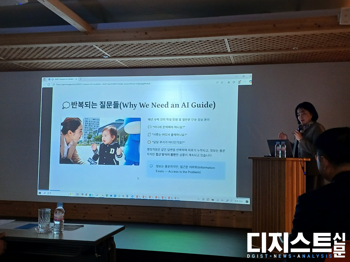 대상을 수상한 'DGIST 캠퍼스 가이드봇'은 학생생활 관련 질문을 자동으로 응답하는 챗봇이다. 수상자 김 팀장은 책자로 배포한 DGIST 학생 생활 가이드북을 학생들이 잘 읽지 않고, 대면이나 전화 문의를 꺼린다는 점에 주목했다. 학생은 에브리타임 같은 익명 커뮤니티에서 질문하는 것을 선호하지만, 이는 정확도와 사실 확인에 문제가 있었다. 분석 결과 학생 질문의 40%는 표준적이고 반복적인 내용으로, AI가 충분히 해결할 수 있다고 김 팀장은 판단했다.