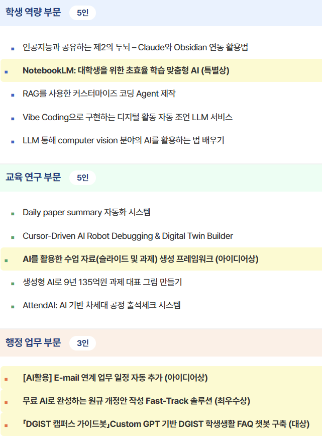 1위 대상은 학생팀 김경아 팀장(이하 김 팀장)의 ▲'DGIST 캠퍼스 가이드봇 – Custom GPT 기반 DGIST 학생생활 FAQ 챗봇 구축', 2위 최우수상은 안전보안팀 권용우 행정원(이하 권 행정원)의 ▲'무료 AI로 완성하는 원규 개정안 작성 Fast-Track 솔루션', 3위 아이디어상은 나노팹지원팀 조호준 기술원의 ▲'E-mail 연계 업무일정 자동 추가'가 차지했다.