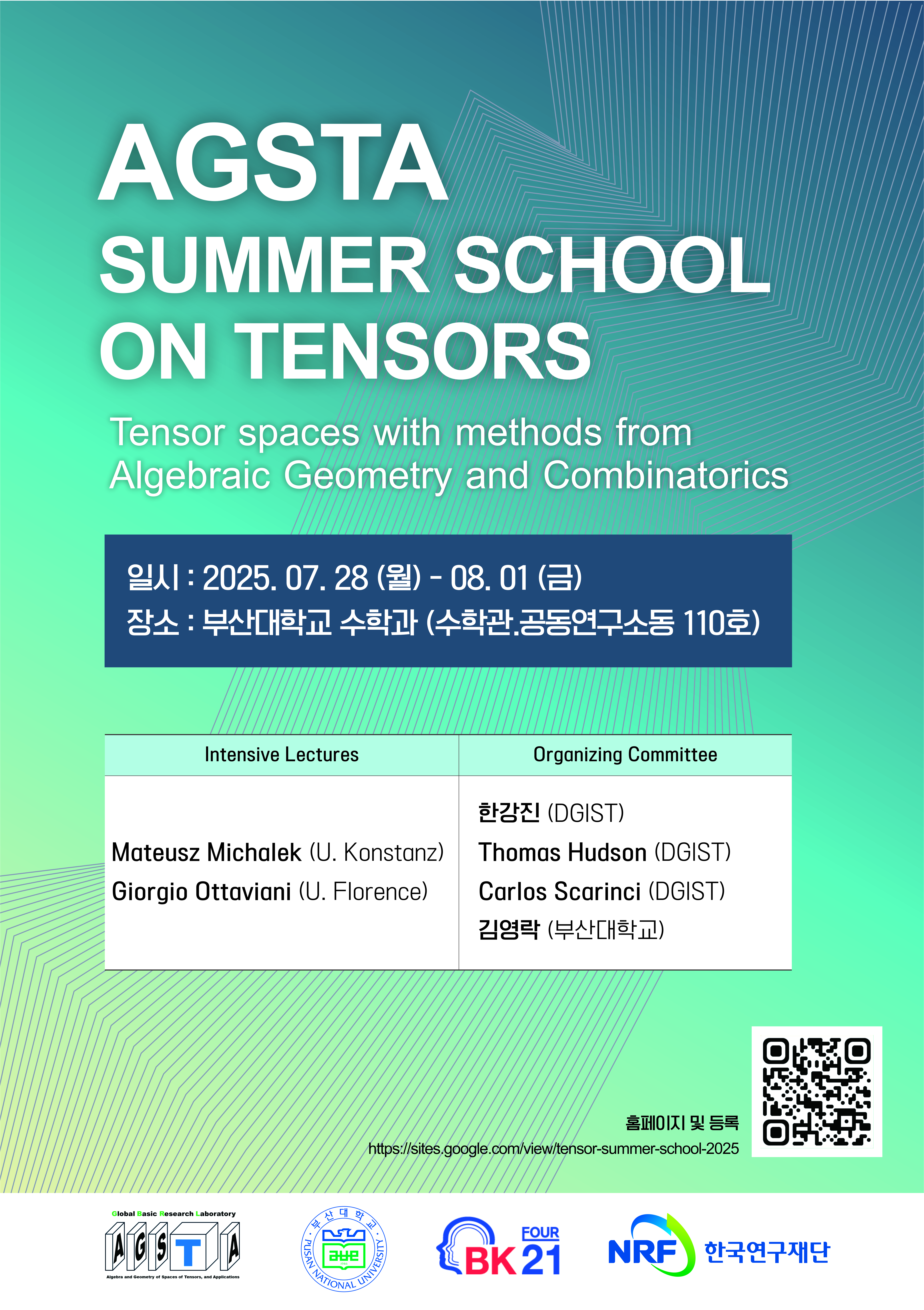 1년에 적어도 한 번씩은 국제적인 학술행사를 개최하는 것을 연구실에서 기획하고 있습니다. 올해에도 7월 28일부터 8월 1일까지 부산대에서 AGSTA summer school on tensors 라는 이벤트를 준비했습니다. 전 세계적으로 텐서공간에 대한 대수학과 기하학적인 연구에 가장 선도하는 두 분의 교수님을 주 강사로 모시고, 학생들이 기초부터 여러 open problem까지 접할 수 있는 자리였습니다. 내년에도 이런 행사들을 개최할 예정이니, 관심이 있는 학생들은 적극적으로 문의해 주시고 참여해 주시기를 바랍니다.