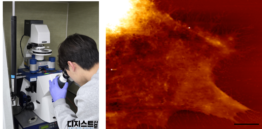생명과학이 전공인 학생은 원자힘 현미경 연구에 참여하면 좋을 것 같습니다. 현재 이영삼 교수님과 공동 연구 중인 연구 주제인데요. 세포의 노화 정도에 따른 물성 변화에 대해 원자힘 현미경으로 측정하는 연구로, 여러 가지 조건에서의 세포 배양부터 원자힘 현미경을 사용한 물성 측정, 분석까지 연구의 전 과정을 경험해 볼 수 있습니다.