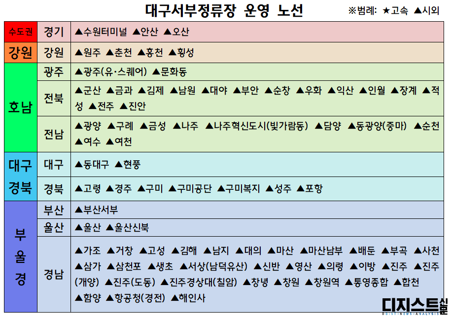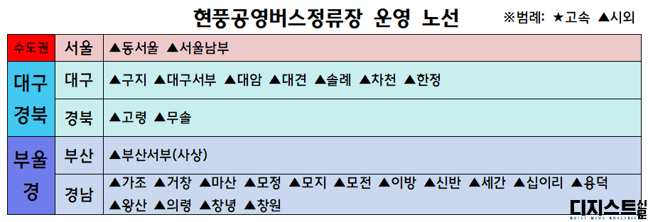 ▲동대구터미널 ▲서대구고속버스터미널 ▲서부정류장 ▲북부정류장 ▲현풍공영버스정류장