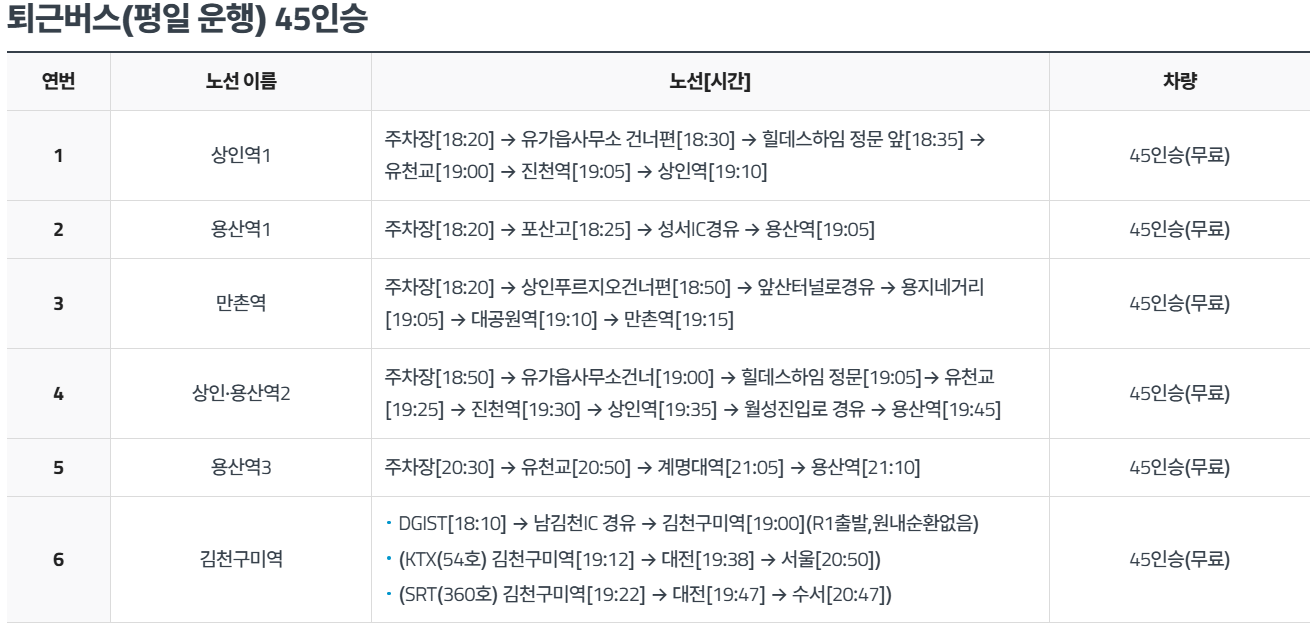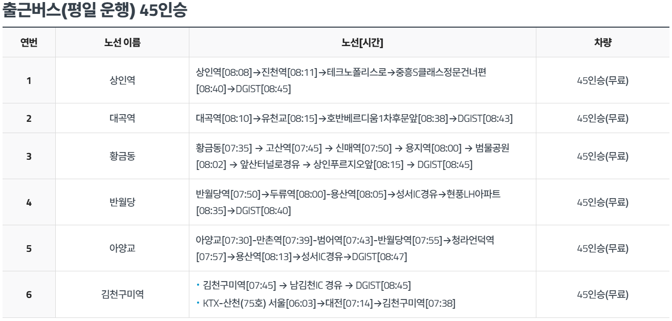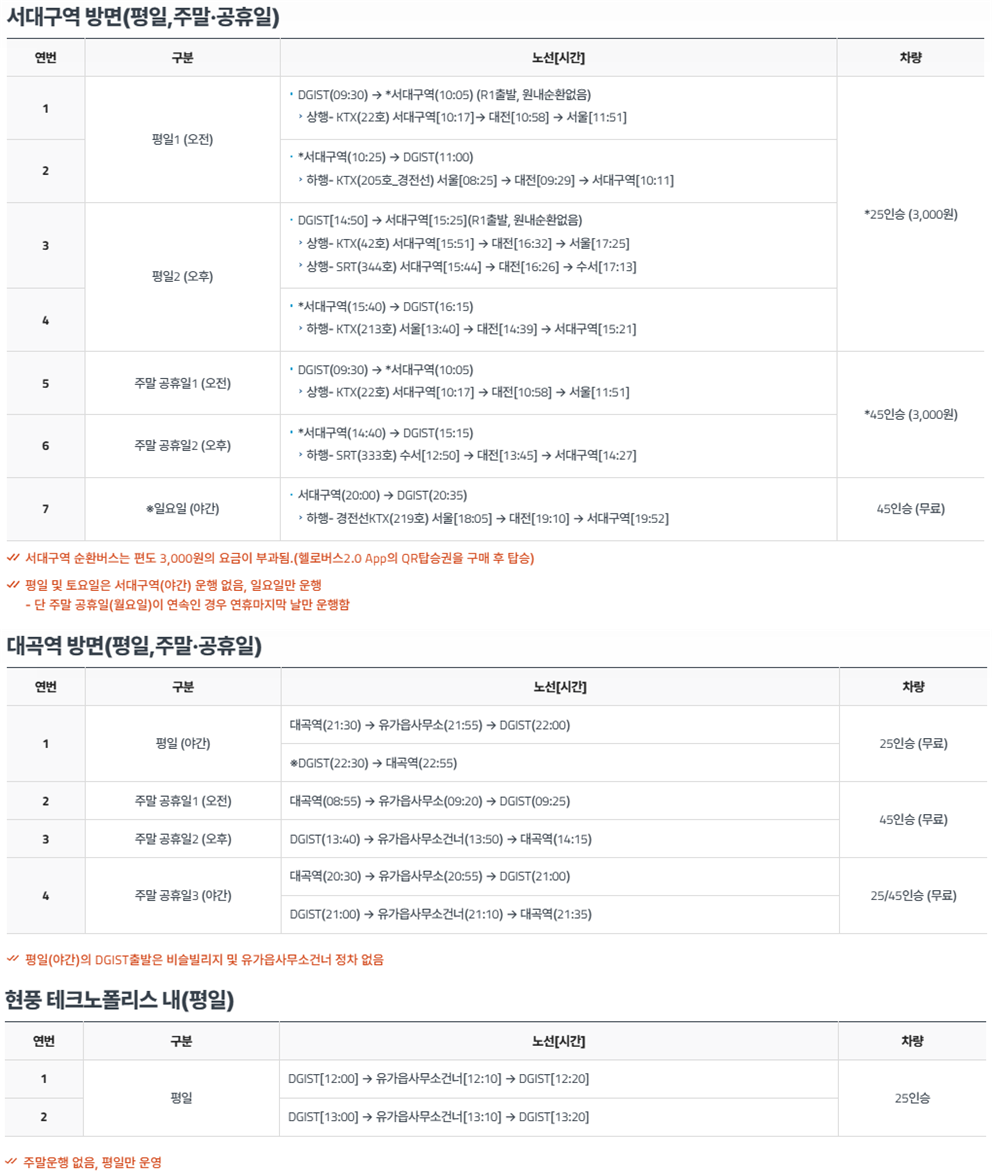 자세한 내용은 DGIST 홈페이지 순환(셔틀)버스 페이지를 참고하면 된다.