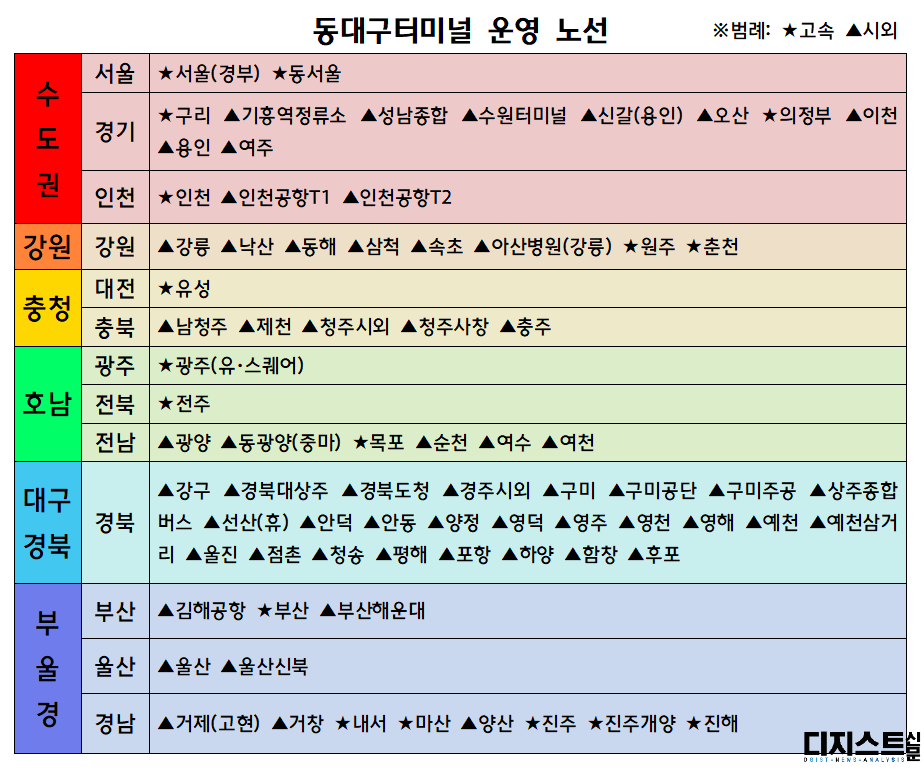 동대구터미널에서는 ▲수도권 ▲강원권 ▲충청권 ▲호남권 ▲영남권 ▲인천공항 노선을 운영한다. 자세한 노선의 경우 아래와 같다.