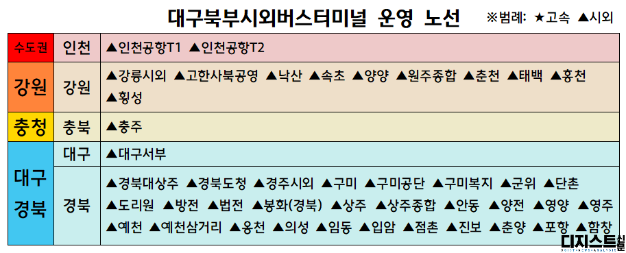대구북부시외버스터미널(이하 북부정류장)은 대구 서구에 위치해 있으며 ▲수도권 ▲강원권 ▲충청권 ▲영남권 노선을 운영한다. 자세한 노선은 아래와 같다.