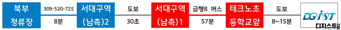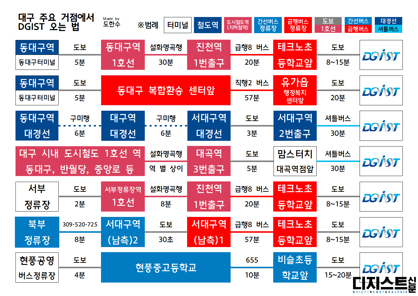 신학기를 맞아 DGIST를 찾는 이들을 위해, 차 없이 대중교통으로 캠퍼스에 도착하는 방법을 정리했다.
