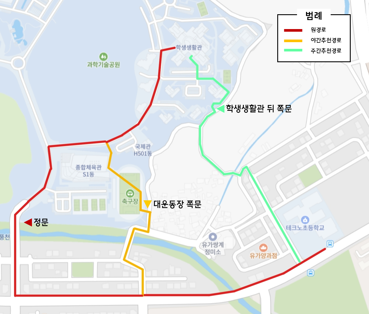야간에는 가로등이 적어 안전을 고려해 대운동장 쪽문을 이용하는 것이 권장된다. 스포츠센터(S1) 옆 계단을 통해 생활관으로 이동할 수 있다. 다만 주간 경로에 비해 계단과 오르막이 많다.