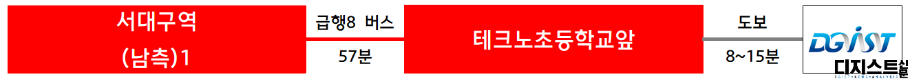 ‘서대구역(남측)1’ 정류장에서 급행8번 시내버스를 탑승해 약 1시간 이동 후 ‘대구테크노초등학교앞’ 정류장에서 하차하면 된다.