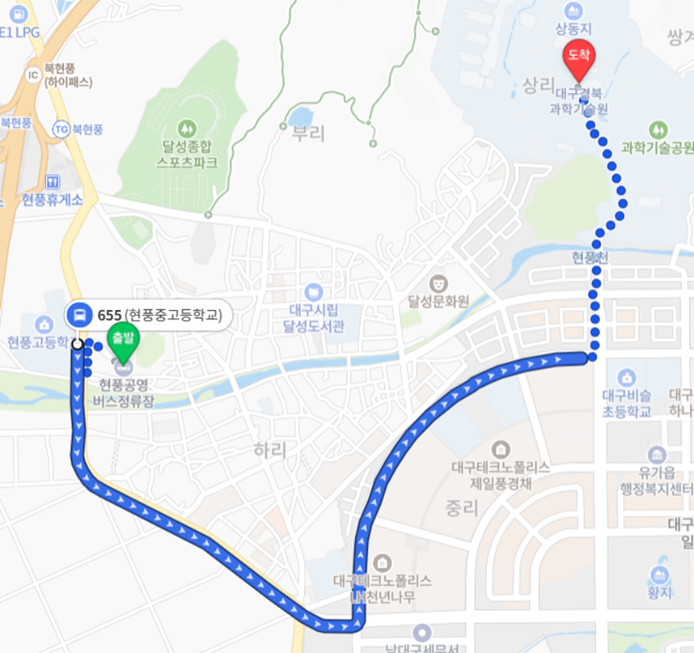 현풍공영버스정류장에서 하차 시, 대로변으로 나와 도로 건너편 ‘현풍중고등학교’ 정류장에서 655번 시내버스를 탑승해 ‘비슬초등학교앞’에서 하차하면 된다(약 10분 소요). 이후 도보로 캠퍼스까지 이동하면 된다.