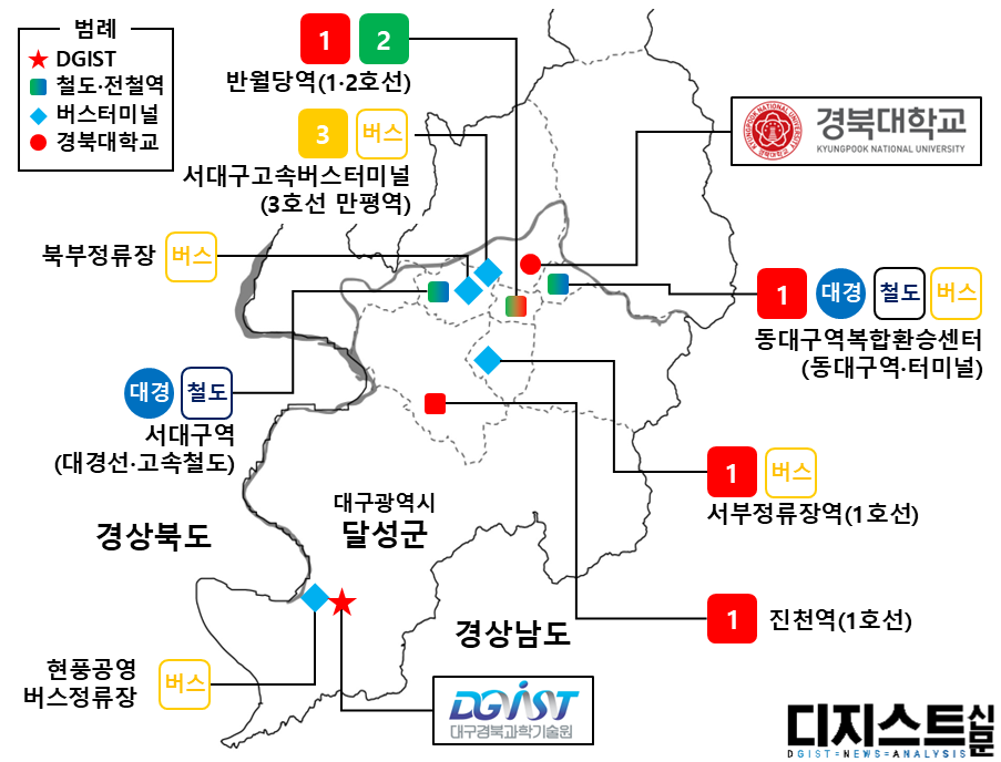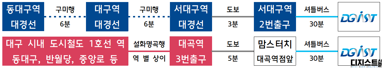 DGIST로 오는 길은 여전히 복잡하다. 다른 권역에서 동대구역까지 이동하는 시간에 더해, 동대구역에서 캠퍼스로 들어오는 데까지 상당한 시간이 소요된다. 또한 여러 번 환승을 해야 하기 때문에 DGIST를 방문할 때는 언제나 여유를 갖고 이동 일정을 잡아야 한다.