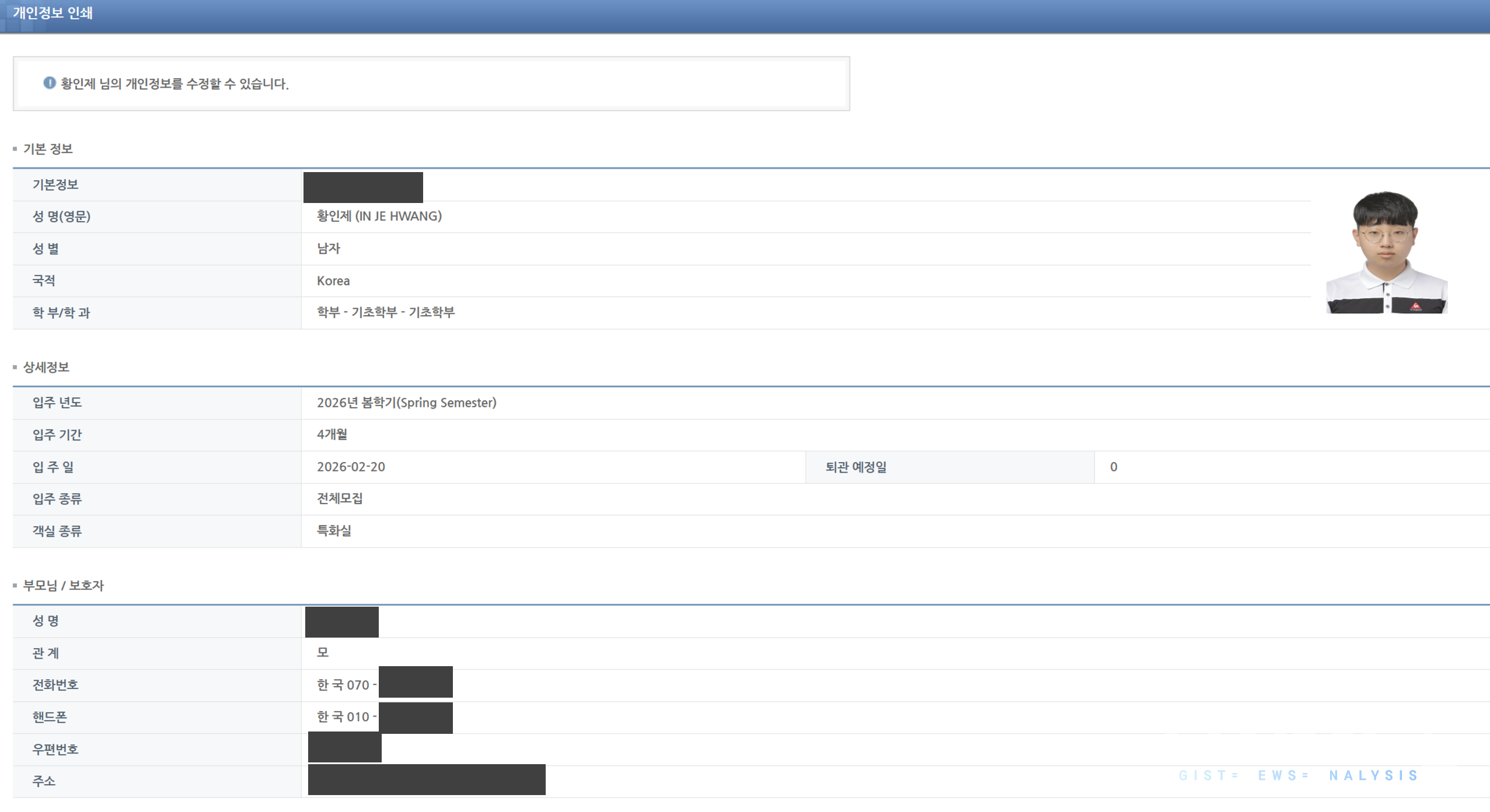 입주생 ▲증명사진 ▲연락처 ▲보호자 연락처 ▲본가 주소 등 무단 확인 가능’