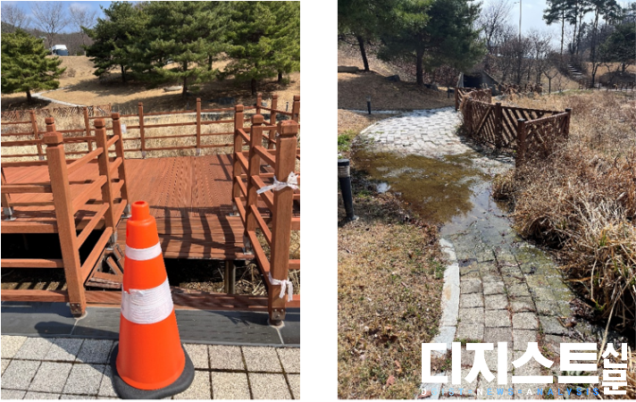 R1 앞 연못은 지난 학기부터 나무 덱이 파손되어 특정 구역에 진입이 불가하다. 또한 옆길을 따라 걷다 보면 길 위에서 발견할 수 있는 물웅덩이는 연못의 물이 새어 나온 것으로 통행을 막고 미관상 좋지 않다.