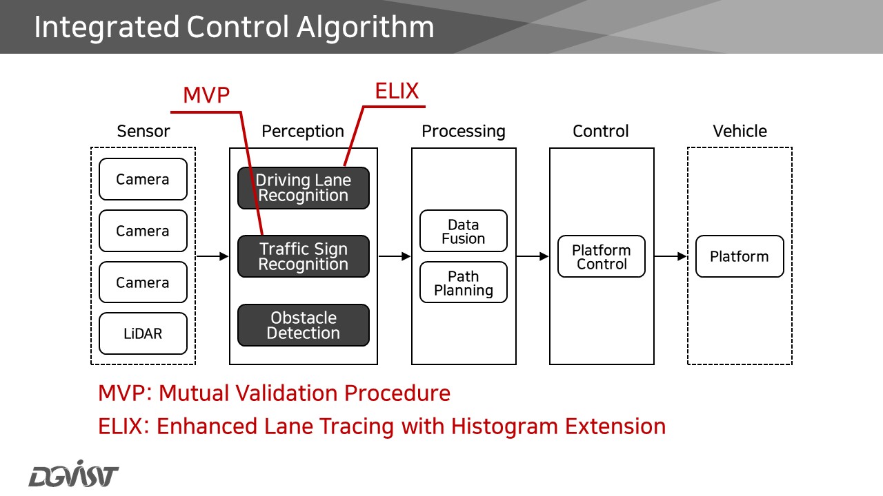 본 연구에서 더욱 집중한 분야는 Perception 단계인데, 그중에서도 MVP(Mutual Validation Procedure) 시스템과 ELIX(Enhanced Lane Tracing with histogram Extension) 시스템을 중점적으로 다루었다. 표지판 인식 알고리즘을 일컫는 MVP 시스템은, 이전 연구에서 사용된 SVM(Support Vector Machine) 방식의 한계(이미지 기호 비율이 충분하지 않은 경우의 낮은 정확성, 단일 알고리즘)를 극복하기 위해 사용된 방식이다. ELIX는 적은 연산량으로 정확하게 차선을 인식한다는 장점이 있는 차선인식 알고리즘이다.