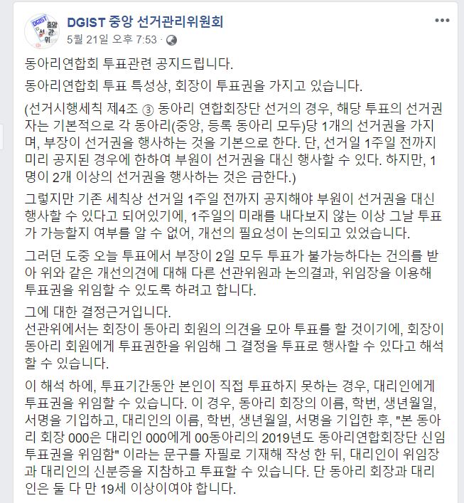이 공지에서, 선관위는 세칙 해석을 달리하여 선거 당일, 동아리장의 위임장과 신분증을 지참할 경우 투표가 가능하다고 밝혔다. 또한 동아리 회장과 위임을 받는 사람이 모두 만19세 이상이어야 한다고 밝혔다. 많은 학생들이 세칙 해석과 결정이 선거 당일에 공지된 점과, 투표자와 위임을 받는 사람의 나이가 만 19세로 제한된 점을 문제로 지적하였다. 이에 선관위는 내부 검토를 걸쳐서 위임장을 사용한 선거 조치를 철회하였고, 현재 공식 입장과 사과문을 발표하겠다고 밝힌 상태이다.