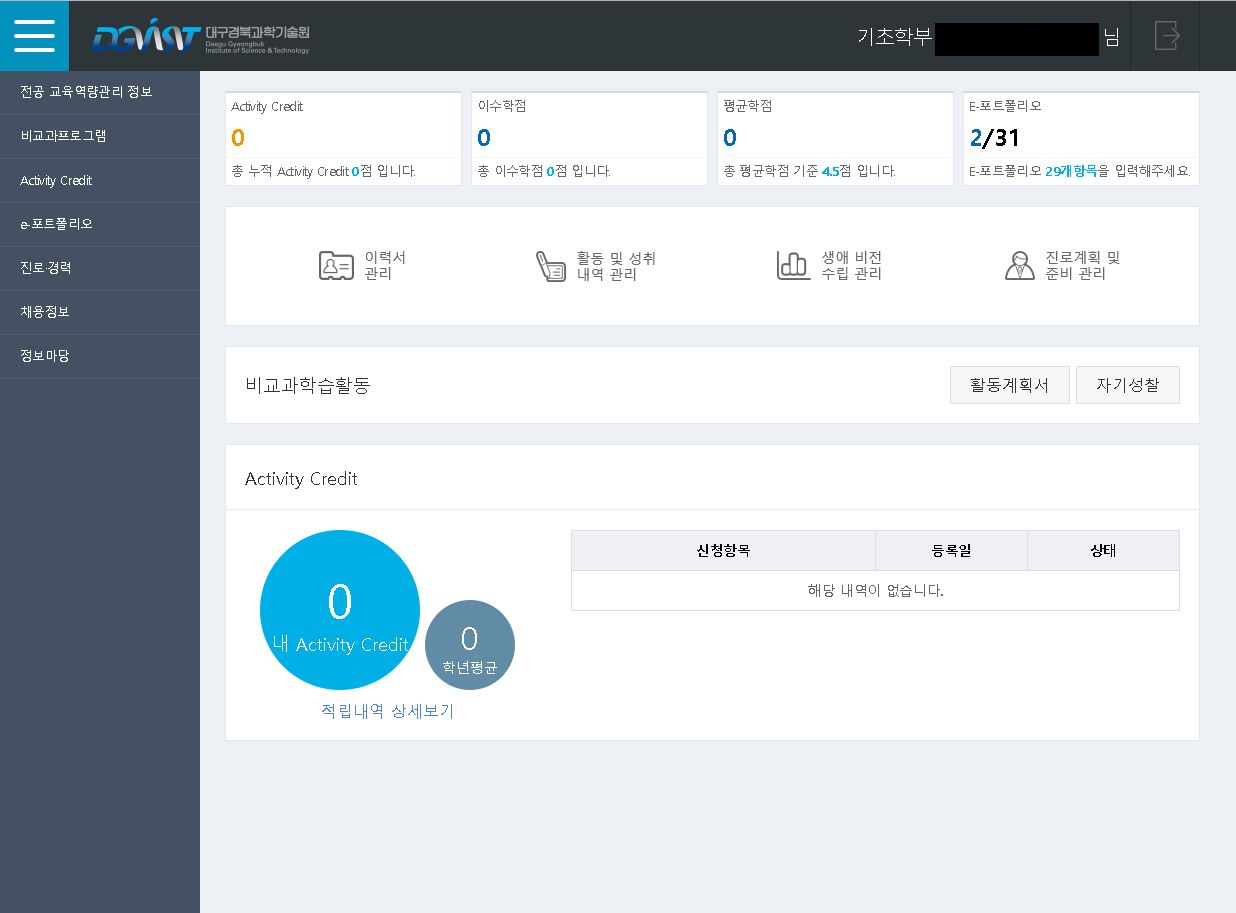 AC제도는 디지스트포털 학생지원 게시판에서 확인할 수 있다. 활동 입력은 학생경력개발시스템에서 가능하다. (http://Career.dgist.ac.kr) 해당 사이트에서는 e-포트폴리오, 채용정보, 직업심리검사, 진로/경력 등을 확인할 수 있다. 추후 사이트 업데이트를 통해 이수과목 확인 등의 추가 콘텐츠를 제공할 예정이다. 특히 e-포트폴리오에서는 이력서, 비교과학습 계획서, 진로 및 자기계발 활동과 관련된 양식을 제공한다. 해당 양식을 활용하면 취업, 대학원 진학에 도움이 될 것이다.