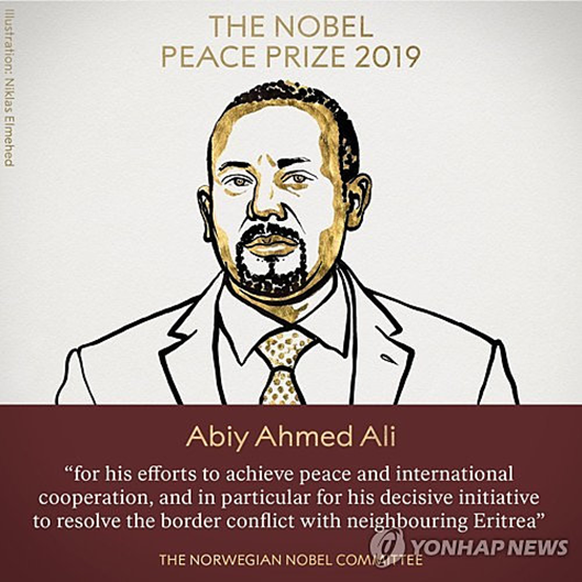 지난 11일 오후 6시 노벨 평화상 수상자가 발표되었다. 아비 아머드 알리 총리(43)는 에티오피아와 접경국간의 분쟁, 특히 에리트레아와의 국경 분쟁을 해결한 것을 큰 공로로 인정받아 노르웨이 노벨위원회로부터 2019년 노벨 평화상 수상자로 선정되었다.