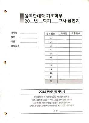 ‘아래 본인은 이 시험의 답안을 작성함에 있어서 다른 사람에게 도움을 주거나 도움을 받지 않을 것이며 다른 매체를 이용하지 않고 온전히 본인의 실력으로 정직하게 임함으로써 DGIST의 명예를 지킬 것을 서약합니다.’