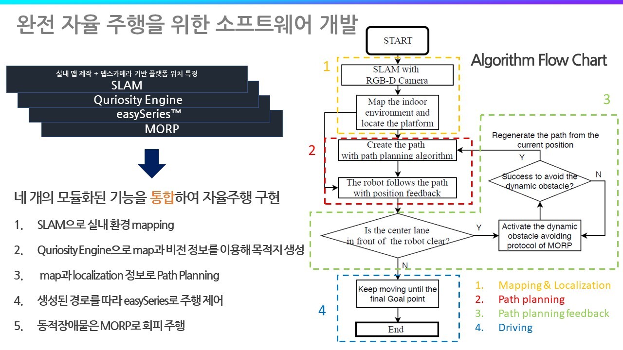 - SLAM, Quriosity Engine, easySeries, MORP 총 네 개의 모듈화된 기능을 통합해서 자율주행을 구현하였다. 실내환경 맵핑은 SLAM으로, 맵과 비전정보를 이용해 목적지를 생성하는 것은 Quriosity Engine으로, 이를 바탕으로 Path Planning을 하여 생성된 경로를 따라 easySeries로 주행을 제어한다. 동적장애물은 MORP를 통해 회피하여 주행한다.