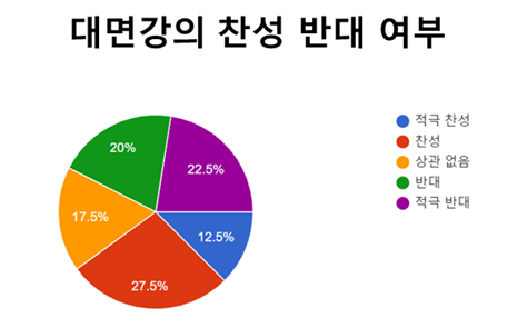 1학기와 달리 DGIST 학생들은 정원 40명 이하 과목에 한해 대면강의를 들어야 한다. 학생들은 앞으로의 대면강의에 대해 42.5%는 반대했다. 그 중 22.5%는 적극 반대이고 20%는 반대이다. 반면 40%는 찬성했다. 12.5%는 적극 찬성이고 27.5%는 찬성이다.