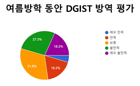설문조사에 응답한 학생 중 여름방학에도 테크노폴리스 내에 거주한 학생은 61.3%이며 이들의 DGIST 방역에 대한 평가는 긍정적이지 않다. DGIST 방역을 불만족스럽게 생각하는 학생은 45.5%으로 매우 불만족인 18.2%와 불만족 27.3%로 구성된다. 22.7%의 학생이 만족스럽다고 답했다. 그 중 매우 만족 4.5%와 만족 18.5%로 구성된다.
