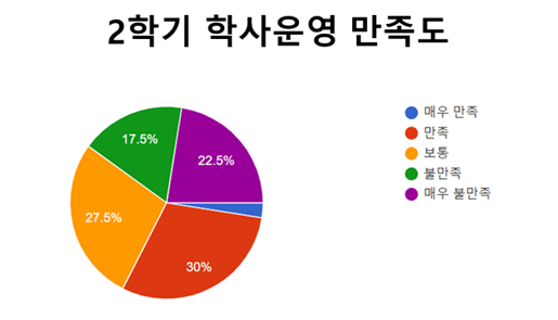 학사 운영은 DGSIT 방역과 매우 밀접한 관계다. 방역에 따라 시시각각 변하는 학사 운영은 학생들에게 매우 중요하다. 개강 이후 DGIST 학사 운영에 대한 평가는 불만족스러운 학생이 많았다. 2학기 학사 운영에 불만을 품은 학생들은 40%로 매우 불만족 22.5%와 불만족 17.5%로 이뤄졌다. 반대의 경우 32.5%로 매우 만족 2.5%와 만족 30%로 이뤄졌다.