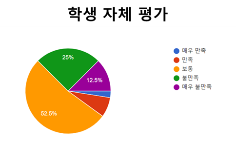 마지막으로 이번 설문조사는 방역에 임하는 태도에 대한 학생들의 자체평가도 이뤄졌다. 학생 자체평가는 만족스럽다는 학생보다 그렇지 않은 학생이 훨씬 많았다. 37.5% 학생들이 불만족하다는 평가를 내렸으며 불만족 25%와 매우 불만족 12.5%로 구성된다. 반면 10%의 학생들이 만족스럽다는 평을 했고 매우 만족 2.5%와 만족 7.5%로 구성된다.