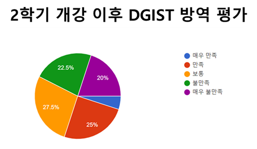 DGIST 방역이 나라에서 내린 지침에 맞추어 진행되었다는 점에서 만족스럽다는 평가를 내렸다. 하지만 학교 내에서 격리된 학생의 경우 최소한의 조치도 없이 대부분 학생 자율에 맡겨 제대로 된 격리가 이뤄지지 않아서 DGIST 방역에 불만족스럽다고 응답했다. 구체적인 사항으로 기숙사 휴게실 사용은 막았음에도 1층 식당은 사용 허가 한 점이 이해 되지 않으며 각 층 학생들의 외출 여부 조사도 제대로 이뤄지지 않음을 꼽았다. 입구의 발열 측정이 항시 이뤄지지 않았고 입구 지킴이의 부재도 빈번했다.
