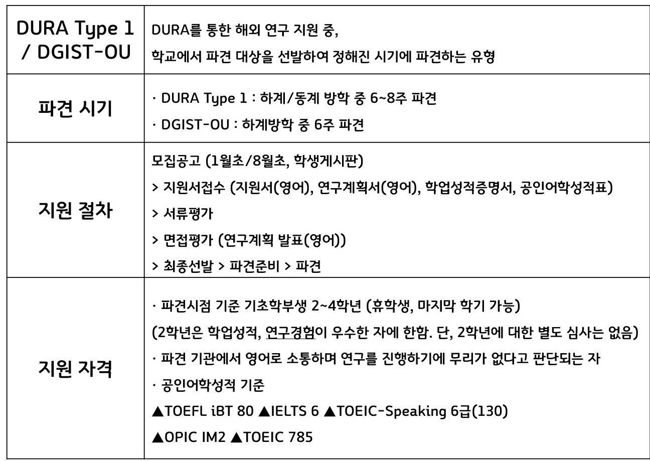 먼저 DURA Type 3이지만 예외적으로 오사카 대학에 선발 파견하는 DGIST-OU 프로그램과 DURA Type 1을 통해 해외 연구에 참여하는 경우, 아래의 표에 정리된 해당 프로그램의 일정을 통해 장학금을 지원받을 수 있다. 주의할 점은, Type 1 기파견자의 경우 Type 1에 재지원할 수 없고, Type 2와 Type 3의 장학금만 수혜 가능하다는 점이다. Type 2, Type 3의 기파견자는 지원 가능하다.