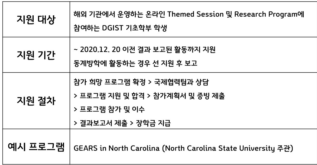 DGIST에는 기초학부생들을 위한 각종 연구활동 지원 프로그램이 있다. 그 중 해외 연구와 관련된 지원 프로그램을 디지스트 신문 DNA에서 알아보았다.