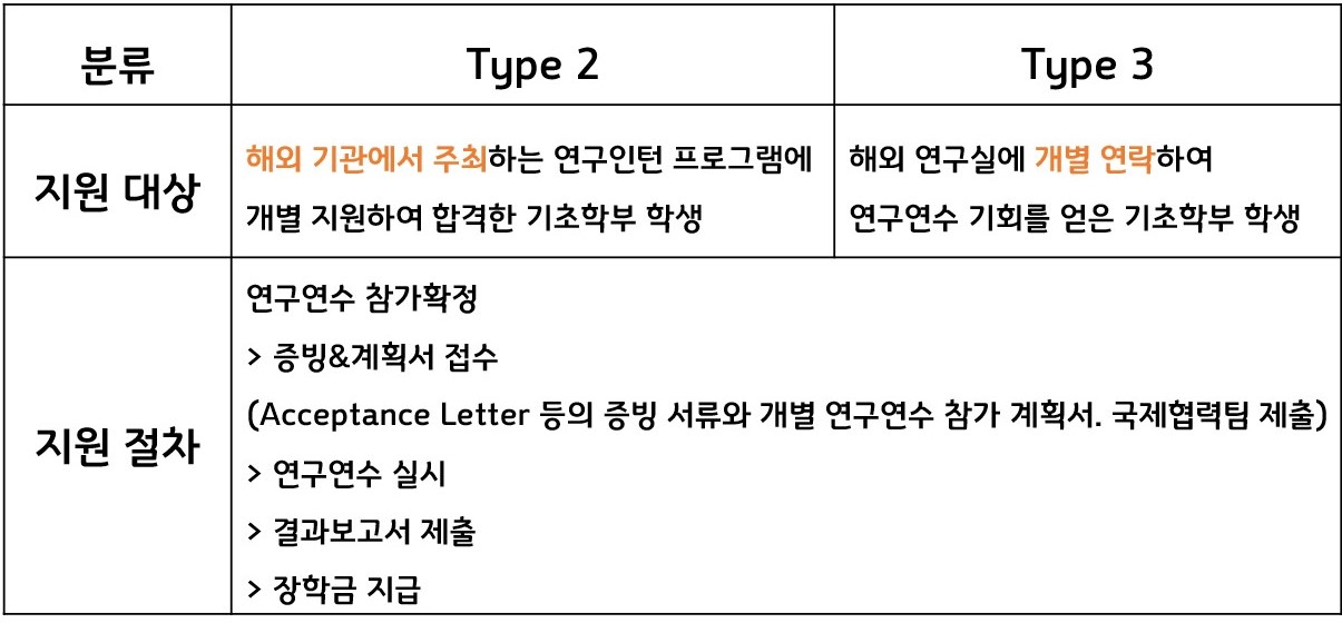 그렇지 않은 경우, 자신의 연구가 연구기관에서 공식으로 주최한 인턴 프로그램 등을 통한 것이면 DURA Type 2, 개별적인 연락으로 성사된 연구 참여라면 DURA Type 3으로 분류된다. 앞서 언급한 DGIST-OU는 학교에서 파견 학생을 직접 선발하는 점에서 Type 1과 유사하지만, 그 혜택이 Type 3에 포함되므로 Type 3으로 분류된다. 자신이 어떤 유형인지 확인한 후 아래의 표에 정리된 프로그램의 일정을 통해 장학금을 지원받을 수 있다. DURA Type 2, Type 3은 학교에서 선발 파견하여 시기가 정해진 DURA Type 1과 달리 지원 시기가 정해져 있는 것이 아니므로 연구 시기에 상관없이 연구에 참여하게 되면 지원 가능 여부를 문의한 후 지원받으면 된다.