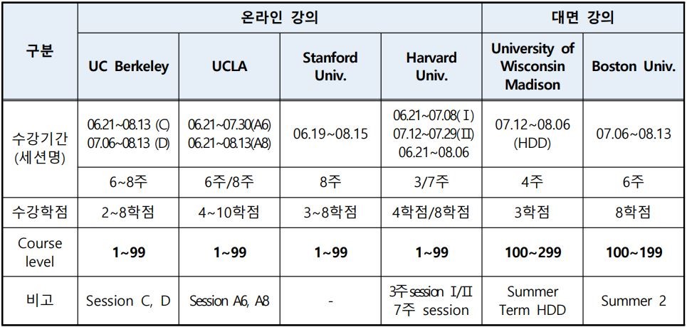 한편, 대면으로 진행되는 위스콘신 대학과 보스턴 대학은 비자 발급을 위한 최소 학점을 위해 각각 3학점과 8학점에 해당하는 과목을 수강하여야 하므로, 수강 희망 과목의 학점을 면밀히 확인한 후 수강 신청을 진행하여야 한다. 이와 더불어, 두 대학의 경우 온라인 강좌는 우선 신청할 수 없다