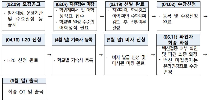 지원 이후 선발 과정 및 수강 신청 과정을 거쳐 2021학년도 FGLP 프로그램에 참여할 수 있으며, 대면 FGLP 파견 학생의 경우 6월 11일에 백신 접종 여부를 확인하여 최종 미국 현지 파견 여부가 결정된다. 그 이외 주요 일정은 아래와 같다.