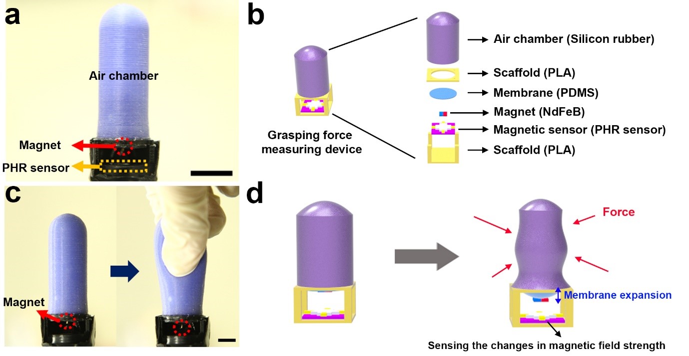 측정 장치의 에어 챔버 부분에 힘을 주면, 내부 압력 변화로 인해 연결된 멤브레인이 팽창한다. 멤브레인에는 작은 자석이 붙어있기 때문에 멤브레인이 팽창하면 자석도 이동하게 된다. 이 자석의 이동을 감지하는 감지센서를 밑에 달아 자석의 움직임을 전기신호로 변환시켜 결과를 출력한다. 정리하자면 에어 쳄버에 주는 힘으로 멤브레인이 팽창하고, 멤브레인에 붙은 자석이 움직이면 움직인 정도를 통해 악력을 계산하는 것이 주된 원리이다.
