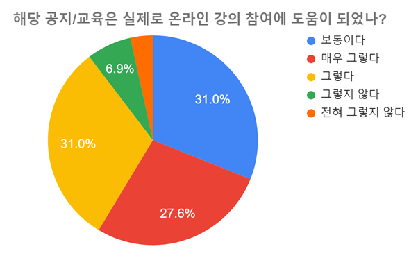 첫 번째로 온라인 강의에 대한 공지나 교육이 제대로 이루어졌는지 확인했다. 88.2%의 학생이 관련 공지 또는 교육을 받았다고 응답했다. 또 해당 안내가 도움이 되었냐는 질문에 27.6%가 매우 그렇다, 31.0%가 그렇다고 답하면서 총 58.6%의 학생들이 학교의 안내가 도움이 되었다고 답했다.