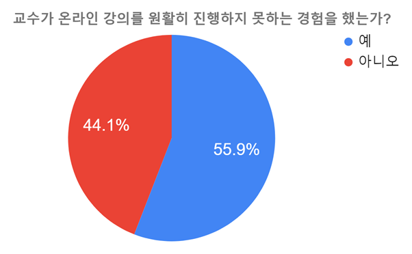 반면 교수로 인해 온라인 강의가 원활히 진행되지 않은 경험을 해봤는지 물어보는 질문에 55.9%의 학생이 그렇다고 답했다. 구체적으로 어떤 상황이었는지 묻는 질문에는 LMS 원격 강의, ZOOM 등의 프로그램 조작 미숙(73.7%)이 가장 큰 문제로 집계됐으며 ▲낮은 마이크 음질과 발화자의 인터넷 상태(10.5%) ▲강의 자료 및 녹화 누락(10.5%)이 뒤를 이었다.