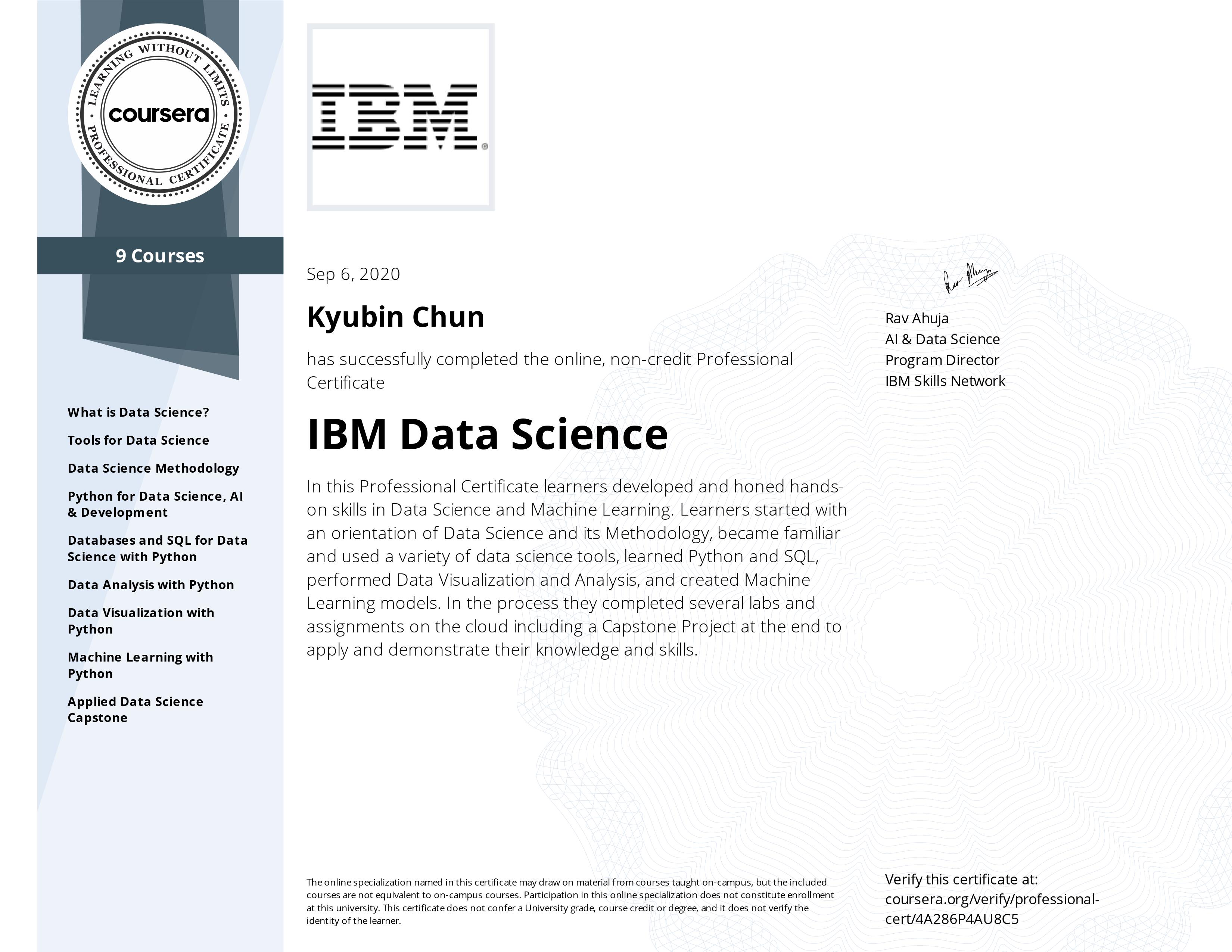 천: AI for Everyone은 정성적인 강의였습니다. 이에 아쉬움을 느껴 다음 강의로는 코딩을 실제로 해볼 수 있는 IBM Data science 강의를 선택했어요. 다음에 신청한 강의의 경우 UGRP 조기수강제도가 폐지되어 UGRP 주제로 고려하고 있던 주제의 강의를 수강하기로 했어요.