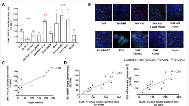 이중 ▲B는 면역세포화학 후 공초점 현미경으로 얻은 샘플 사진 ▲A는 각 사진에 대해 LMX1과 FOXA2 signal이 동시에 나타나는 세포의 영역을 핵 대비 영역으로 환산하여 통계 분석한 것 ▲C는 A의 값이 세포 내 콜레스테롤 수치와 연관이 있는지 보여주는 지표 ▲D는 A의 값이 Gli1 mRNA 전사 정도와 연관이 있는지 보여주는 지표이다.
