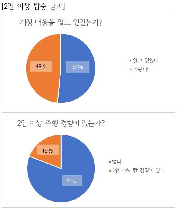 설문 응답 인원 중 2인 이상의 전동킥보드 탑승이 법으로써 규제된다는 것을 아는 학생은 절반을 조금 넘었으며, 이를 준수하고 있었던 학생은 81%로 더 많았다.