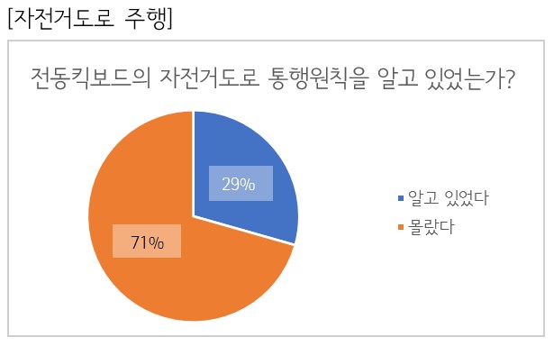 <도로교통법> 제13조의 2에 따르면, 전동킥보드는 자전거 도로(도로교통법 제15조 1항에 의한 정의)로 통행하거나, 자전거 도로가 설치되지 않은 곳에서는 도로 우측 가장자리를 통해 통행해야 한다. 이전 개정 도로교통법부터 자전거도로 통행 원칙이 존재했으나, 설문조사에 응답한 전체 학부생 중 70.6%에 해당하는 48명의 학부생이 자전거도로 통행이 원칙임을 몰랐다고 응답하며 자전거도로 통행 원칙에 대한 낮은 인식률을 보였다.