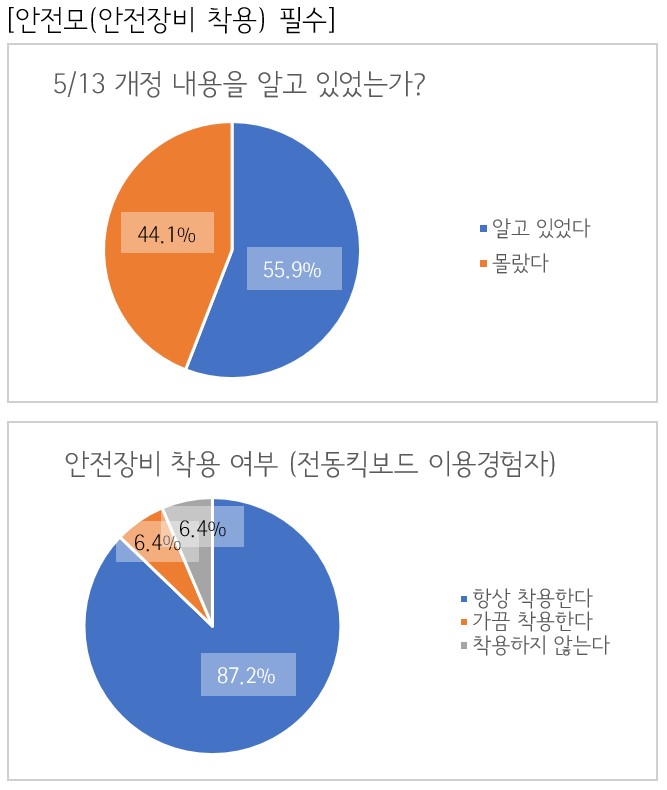 설문조사에 응답한 전체 학부생 68명 중 55.9%에 해당하는 38명의 학부생이 안전모 착용이 필수임을 알고 있다고 응답했고, 전동킥보드 이용 경험이 있는 학부생 중 87.2%에 해당하는 41명의 학부생이 주행 중 안전장비를 착용하지 않는다고 응답했다.