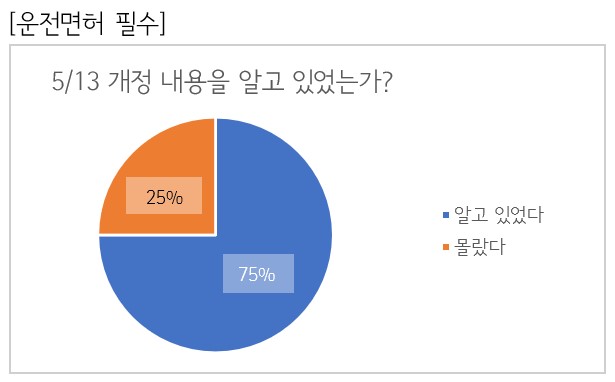학부생 대상 설문을 통해 개정된 도로교통법 내용 중 운전면허가 필수임을 알고 있는지를 확인했다. 설문조사에 응답한 전체 학부생 68명 중 75.0%에 해당하는 51명의 학부생이 운전면허 소지가 필수임을 알고 있다고 응답했다.