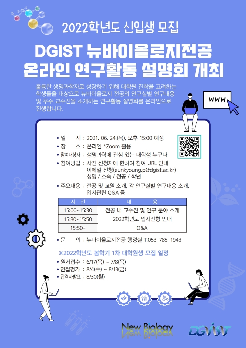 6 24일 오후 3시부터 뉴바이올로지 전공에서 대학원 진학에 관심이 있는 기초학부생 및 타대학 학생을 대상으로 온라인 연구활동 설명회를 진행한다. 참여를 희망하는 학생은 이메일(eunkyoung.p@dgist.ac.kr)로 성명/소속/전공/학년을 기재하여 사전신청을 해야 한다.