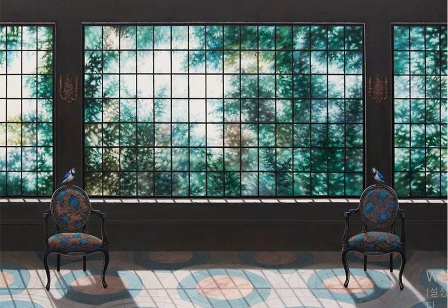 갤러리에 들어서자마자 마주치는 벽에 녹색, 다홍색, 청보라색이 오묘하게 어우러진 신비로운 숲이 걸려있다. 노혜영 작가의 <Fluffy forest> 연작이다. 하얀 벽과 대비되는 강렬한 색감은 시선을 잡아끄는 힘을 지녔다. 멀리서 본 그림은 환상 속에서 본 듯 몽환적이면서도 울창한 숲의 정경을 묘사한다. 그러다 그림에 조금 더 가까이 다가서면 그제서야 색색의 풍선을 단 자동차, 낙하산을 탄 사람들, 소용돌이 모양의 길을 따라 나무 사이를 헤쳐 나아가는 붉은 버스를 보게 된다. 그토록 뚜렷하게 대비되는 색인데도 가까이 다가서기 전까지는 보지 못했다. 그러나 한 번 존재를 인식하고 나면 아무리 멀리서 보아도 숲의 나무들보다 사이사이의 조그마한 자동차와 낙하산이 먼저 눈에 들어온다. 우리의 눈은 나무와 숲을 동시에 보기를 어려워하는 것 같다. 대상을 보는 시야를 달리하면 종종 새로운 것이 눈에 들어오기도 한다.