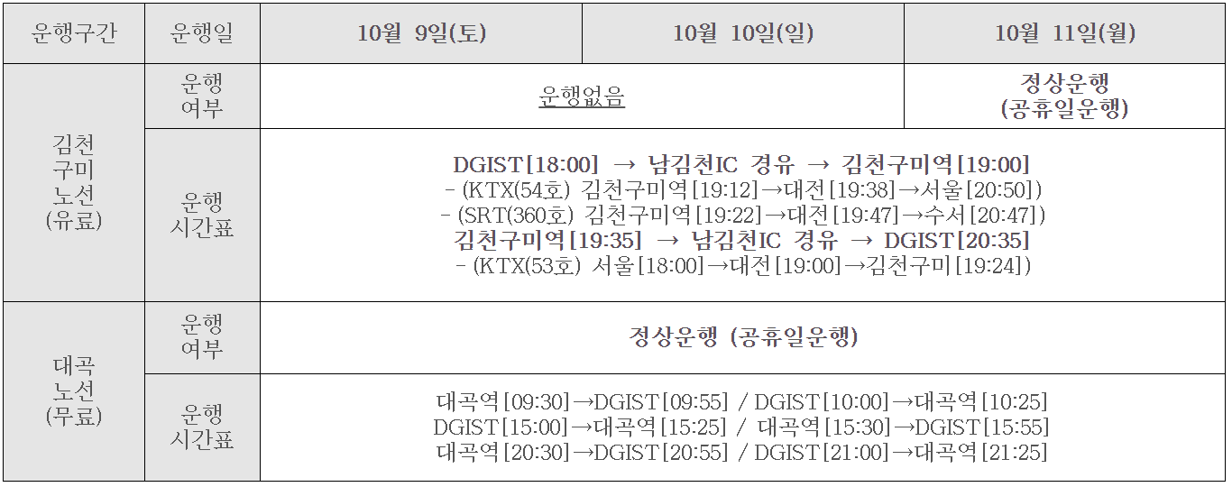 10월 2일부터 4일까지 3일의 개천절 연휴기간과 10월 9일부터 11일까지 한글날 연휴기간에는 통근버스는 운행하지 않으며 비슬빌리지 앞에서만 중간정차하는 45인승 셔틀버스를 아래 표에 따라 운행한다.