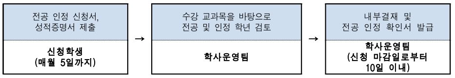 전공 인정 확인서 발급을 희망하는 학부생은 수강 중인 과목을 포함해 자신이 이수한 과목을 바탕으로 어떤 전공을 인정받을 수 있는지 확인해야 한다. 14~19학번 학부생의 전공 인정 여부는 이수한 교과목을 바탕으로 전공 트랙 대표 교원이 판단하며, 20학번 이후 학부생은 이수 학점 및 신청 학생의 학년에 따라 인정 학년이 구분된다. 20학번부터 인정 학년은 신청 학생의 학년/학기 차수를 초과할 수 없으며, 인정 학년은 아래와 같다.